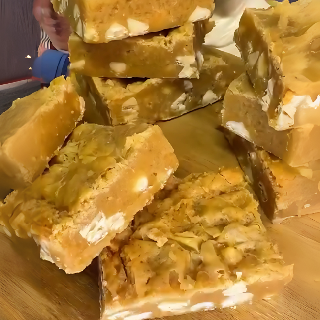 - Derretir 125 g de mantequilla + 1 taza de chocolate blanco picado + 240 g de azúcar (rubia) + 2 huevos cuando esté todo integrado agregar 150 g de harina sin polvos de hornear + 1/2 cucharadita de polvos de hornear.