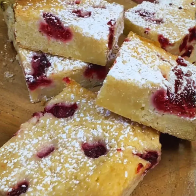 - Poner sobre la masa 1 taza de frambuesas congeladas.