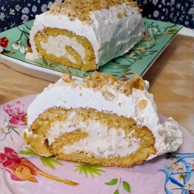 - Sacar del horno, pasar un cuchillo por los bordes, dar vuelta el bizcocho sobre un paño con azúcar flor y enrollar. Este proceso debe ser rápido. Reservan