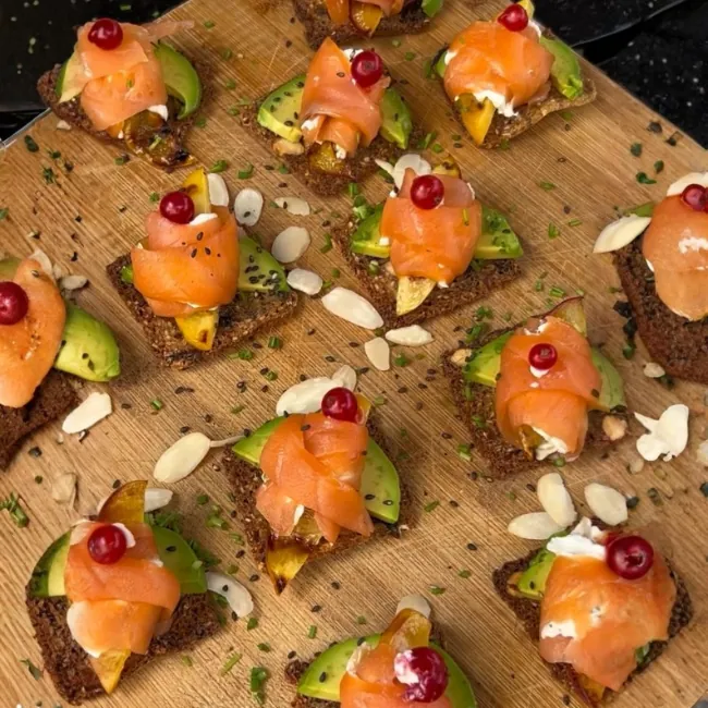 - Poner las tostadas en una bandeja, cubrir con un trozo de palta y luego poner el rollo de salmón, decorar con zarzaparrilla o el berry que más te guste y terminar con sésamo negro y las almendras laminadas.