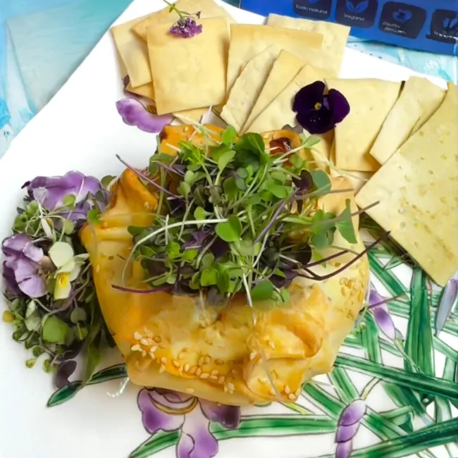 - Extiende una masa del supermercado de empanadas XL para el horno o de hojaldre. Pon un queso camembert en el centro y haz cortes en la superficie con un cuchillo.