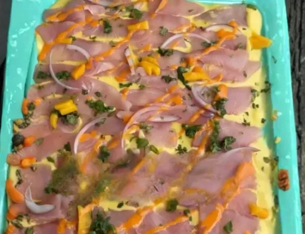 Tiradito de reineta con dresing de mango y mayo de syracha
