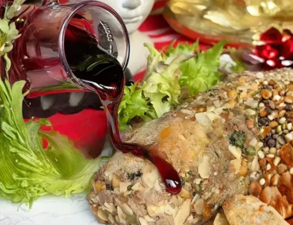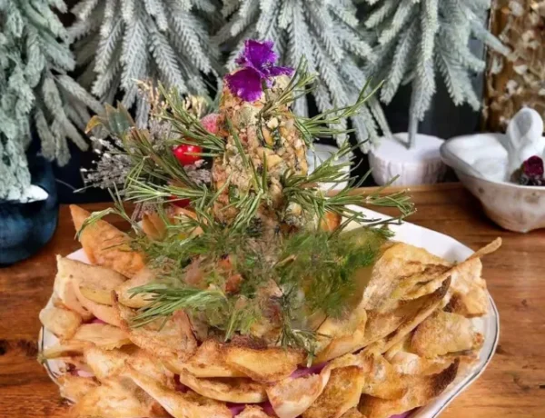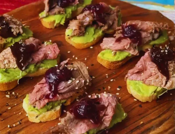 Bruschetas con roast beef, palta y cebolla caramelizada al merlot