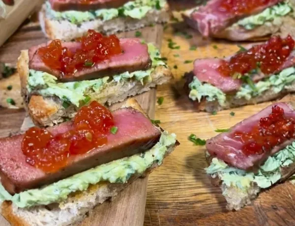 Entradas / Recetas / Recetas Bruschetta de tataki de atún con palta y queso crema con mermelada de tomate