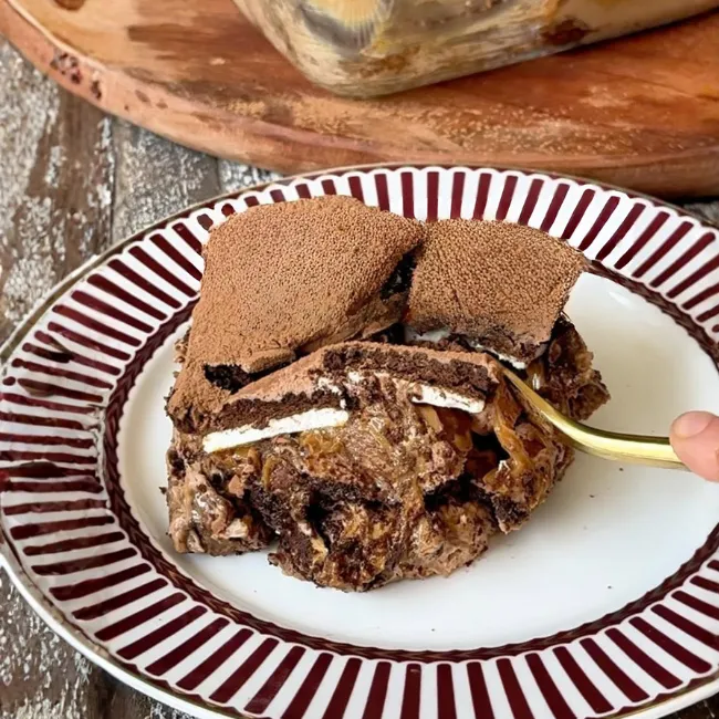 - Cubrir la base de una fuente con galletas de chocolate, (si tienen relleno ábrelas y úsalo una la crema de chocolate) baña las galletas con leche (la que uses).
