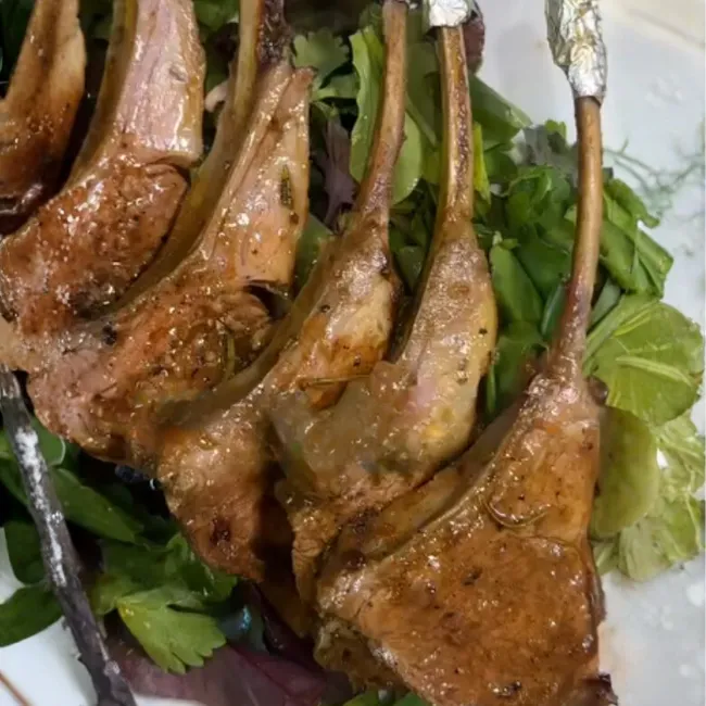 2. En un sartén grande con aceite de oliva caliente, dorar por todos los lados, 2 Racks de costillitas francesas de cordero. Cuando estén bien doradas, poner en una fuente.