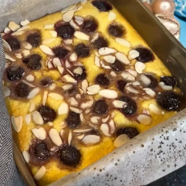 - Poner en un molde cuadrado, previamente aceitado y con papel encerado, agregar 500 g de guindas sin carozo (o los berries que más te gusten) y enterrarla un poco en la masa.