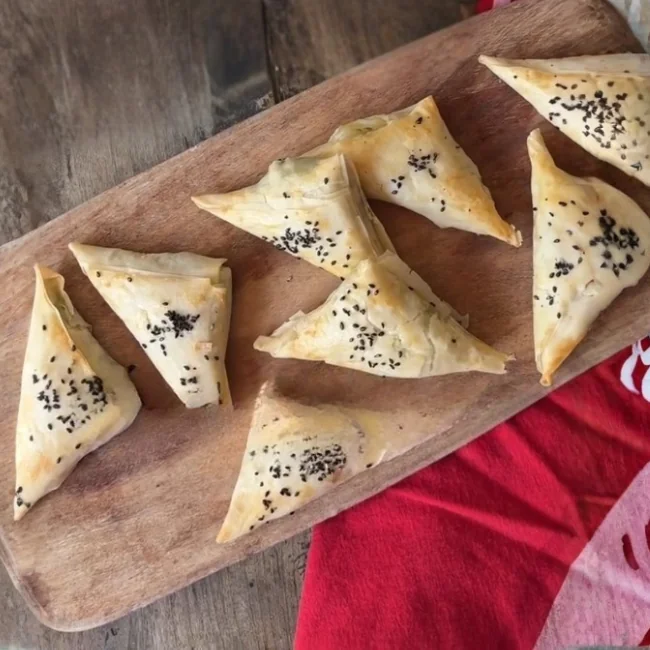 6. Poner una cucharada de la mezcla de espinacas en una de las esquinas del borde, doblar la masa para cubrir el relleno haciendo un triángulo sin salir de los bordes de la masa, seguir doblando con esta misma forma guiándote por los bordes hasta usar toda la masa.