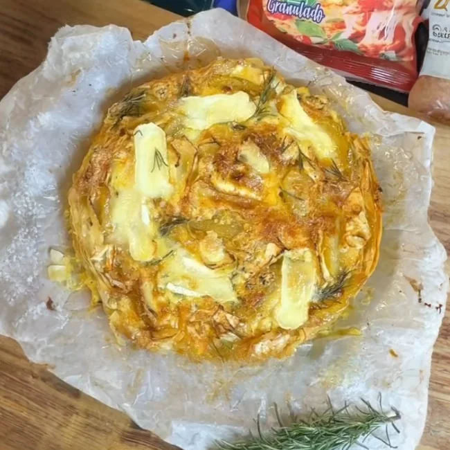 - Corta en láminas delgadas 2 Quesos Camembert e introduce en los pliegues de la masa de la tarta.