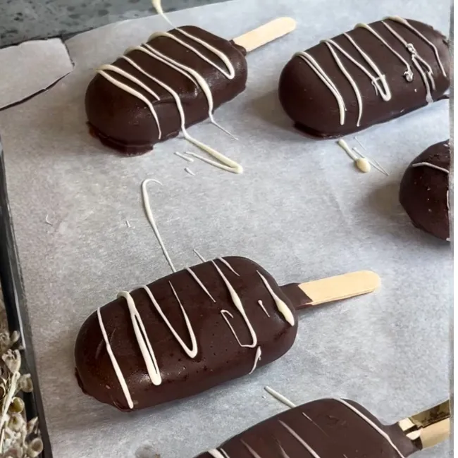 4. Cuando los helados estén congelados sumergir dentro del chocolate y dejar enfriar sobre papel encerado. Derretir en el microondas una pequeña cantidad de chocolate blanco sin azúcar, ponerlo en Una bolsita para hacer líneas de decoración sobre los helados.