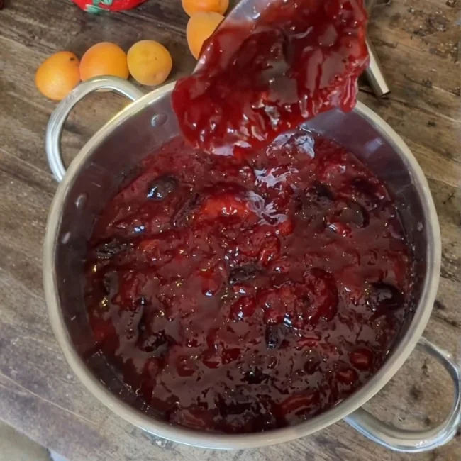 - En un bowl grande poner 500 grs de damascos sin carozo + 1/2 taza de guindas sin carozo + 250 grs de endulzante en polvo en polvo, revolver levemente y dejar reposar, ojalá toda la noche, para que la fruta suelte todos sus jugos.