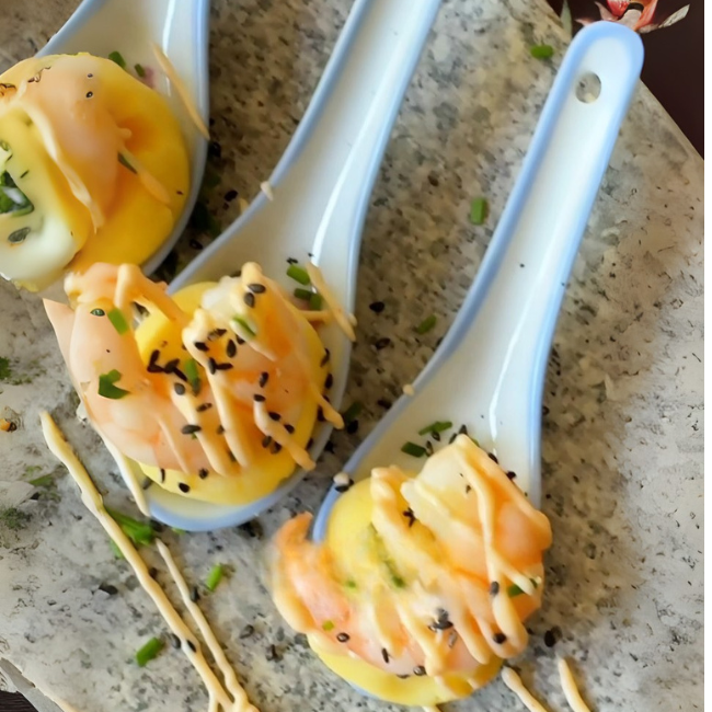 - Hacer bolitas pequeñas (que te puedas meter a la boca) con el puré y ponerlas en un plato para servir o en cucharitas. Cubrir con 1 camarón y decorar con líneas de mayonesa de syracha + sésamo + cibulette o cilantro.