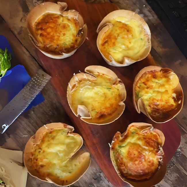- Acomodar 6 masas de taco (use de las rapiditas que son más pequeñas) en moldes para muffins y rellenar 3/4 con la mezcla anterior.
