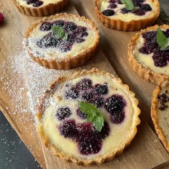 3. Poner un puñado de moras sobre las masas de galleta (puedes poner la fruta que más te guste). Y verter la mezcla sobre cada molde hasta cubrir la fruta.