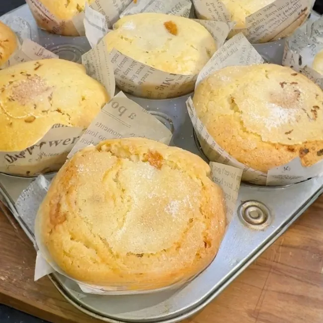 - Rellenar 3/4 de los moldes y con ayuda de una manga plástica o bolsa poner en el centro una buena cantidad de manjar o dulce de leche (con generosidad plis ) y espolvorear la superficie con azúcar.