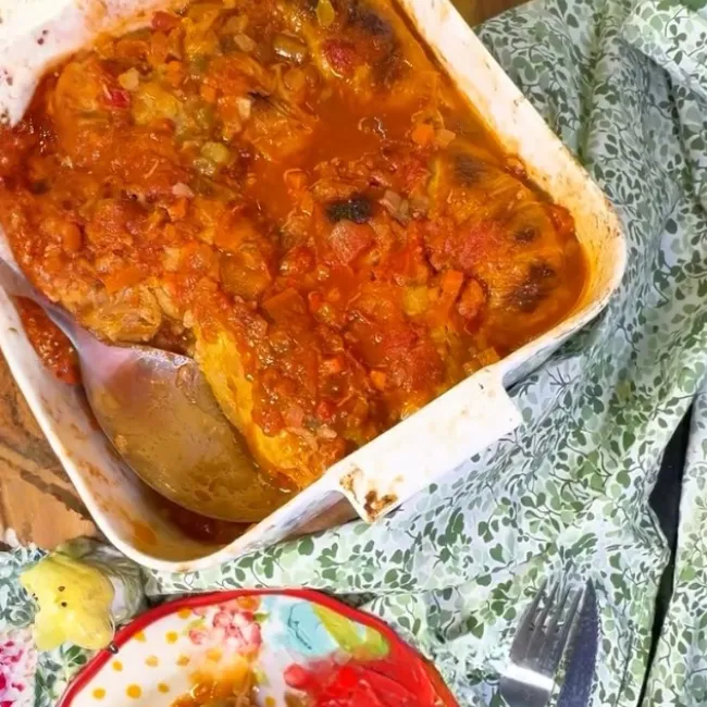 7. Cubrir la fuente que vas a usar, con parte de la salsa ligera de tomates, acomodar los niños envueltos apretados entre sí, para que conserven bien la forma y cubrir todo con el resto de la Salsa.