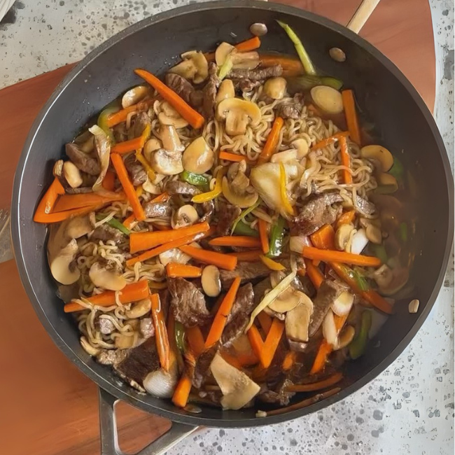 - Agregar la pasta al sartén, junto con la carne y las verduras.