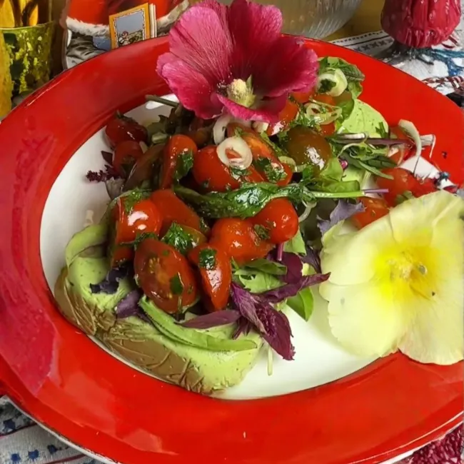 - Para servir, retirar el plástico y poner el paté de palta en un plato para servir. Cubre con una taza de hojas Baby y luego agrega el pebre de tomates cherry y decora con flores comestibles.