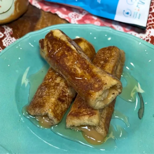 - Hacer una mezcla con 1 huevo + 3/4 taza de leche (la que uses) + 1 cucharadita de endulzante en polvo. Pasar los rollos de pan por la mezcla, girando para empapar por todos lados.