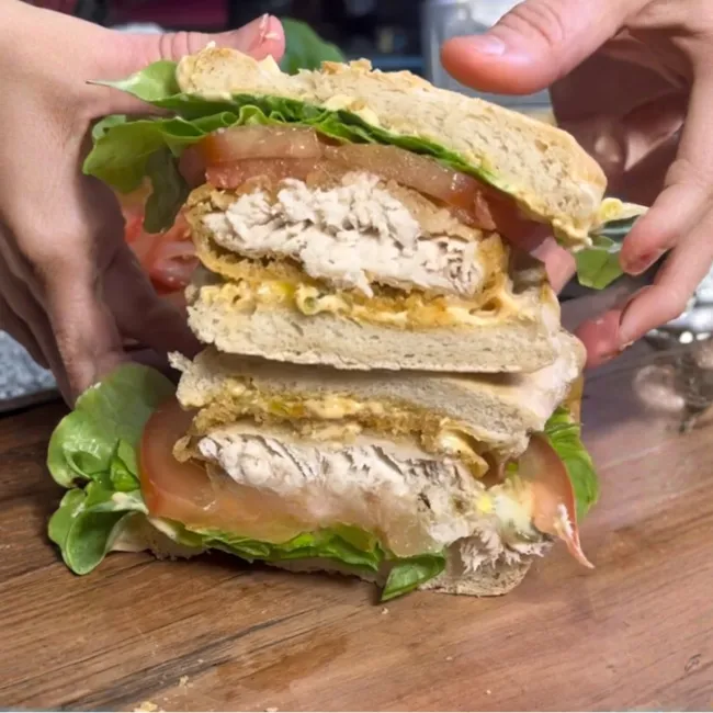 - Armar el sándwich con un buen pan con aceite de oliva dorado al sartén, ¡¡¡la salsa, tomate, lechuga y el pescado frito!!!