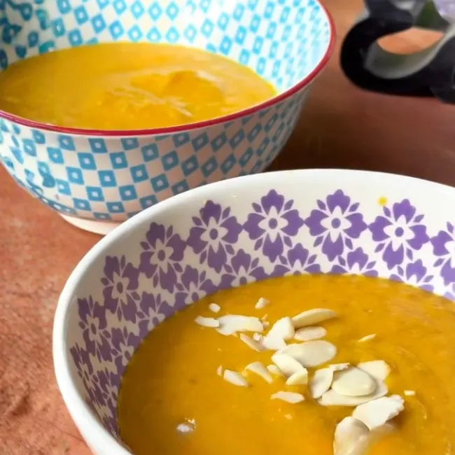 Sopa de zapallo, peras, ajo y jengibre asados