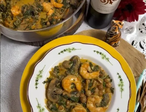Garbanzos con champiñones y camarones al curry con leche de coco