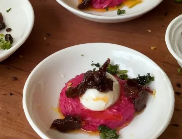 Entradas / Recetas / Recetas Bolitas de queso fresco sobre hummus de betarraga y tomate macerado en miel