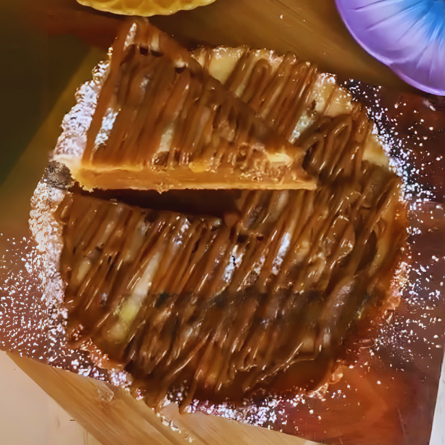 - Refrigerar por unas horas para enfriar y espolvorear con azúcar Flor y con la ayuda de una manga o una bolsa hacer líneas de Manjar sobre la tarta.
