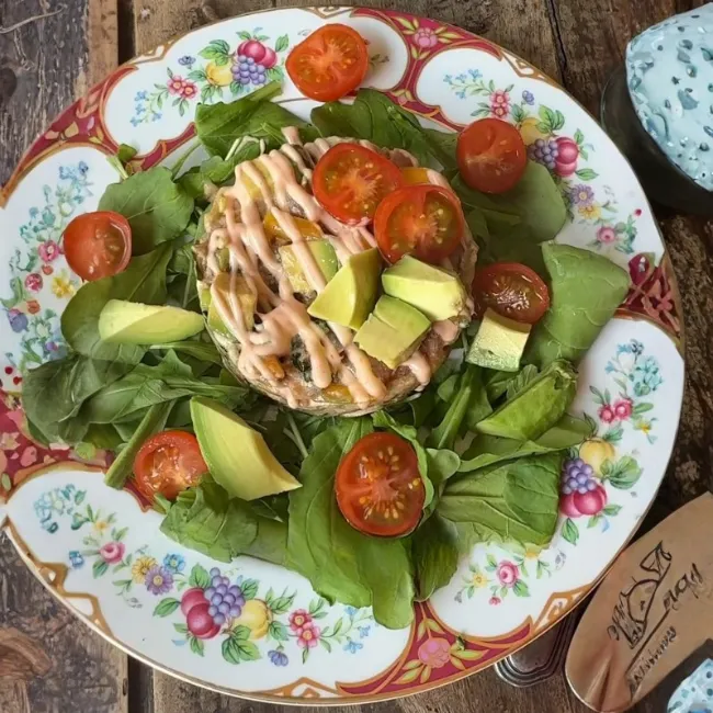 - Para servir, poner en el plato una cama de hojas verdes y con un timbal (un aro) dar la forma redonda, apretar bien para que se mantenga. Decorar con mayonesa de Siracha, tomates cherry, palta y sesamo Negro.