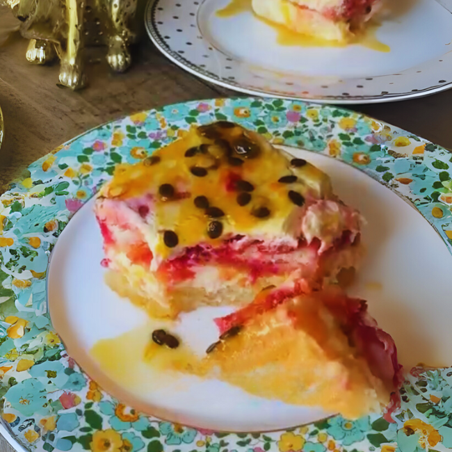 - Para servir cubrir con el resto de salsa de Maracuyá y cortar en cuadrados.
