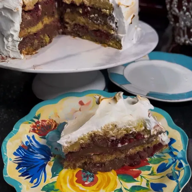 Torta de bizcocho con ganache de chocolate, frambuesas y merengue sin azúcar