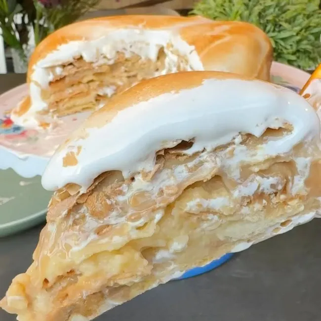 Torta de hojarasca con manjar, crema pastelera y merengue