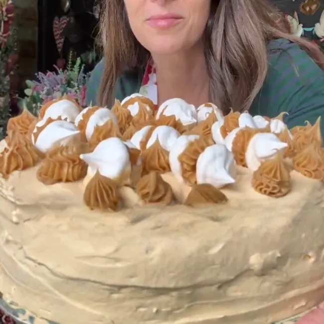 - Para servir poner manjar en una manga pastelera (tiene la textura perfecta para dar la forma y que no se aplaste después de un rato) y hacer cachitos en la superficie junto con los merenguitos rellenos con manjar que tenías reservados.