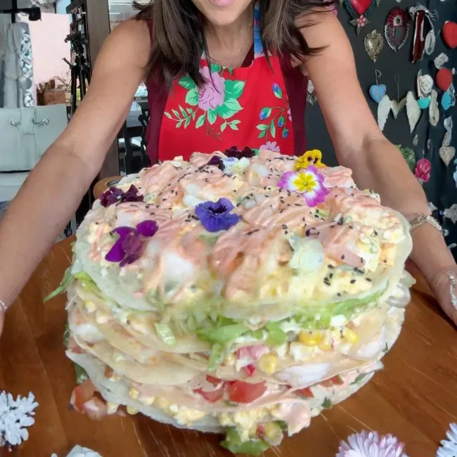 - Puedes armar la torta rellenando con las verduras o las mezclas que quieras. Pon una fina capa de salsa o mayonesa sobre cada panqueque para que se adquieran bien las verduras que pongas y conserven la humedad.