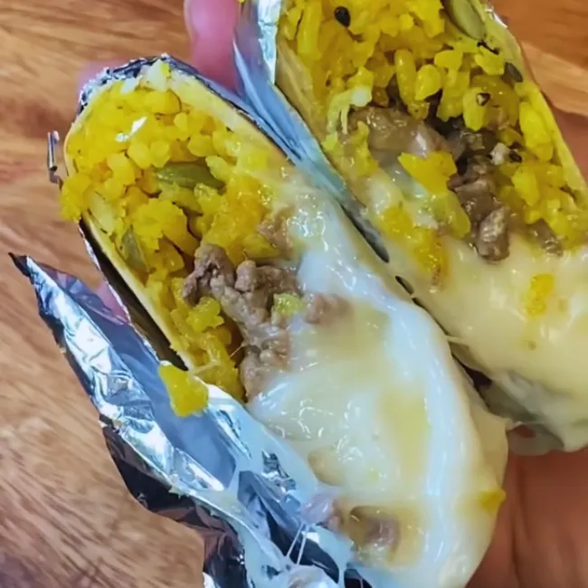 - Estirar una masa de taco, pincelar con mayonesa en el centro y agregar una cucharada de arroz (puede ser recién hecho o del día anterior) + la carne + el queso que más te guste.