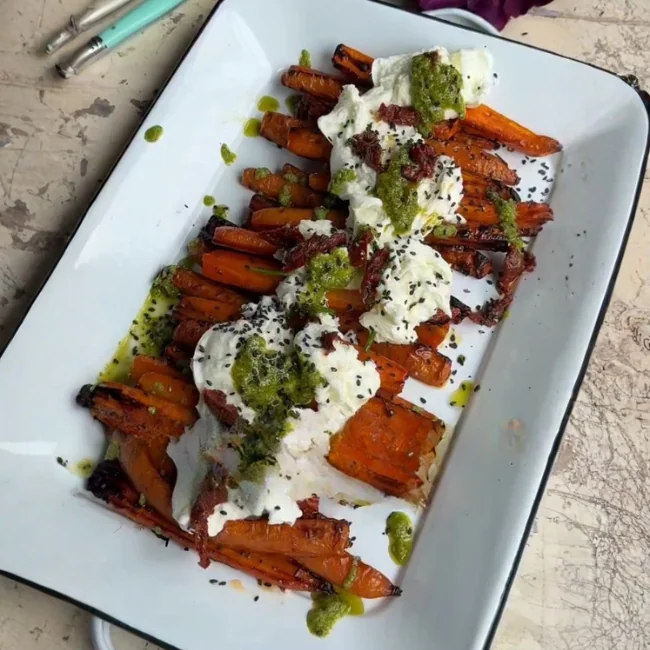 Zanahorias asadas con miel con mozzarella de bufalla y pesto de albahaca